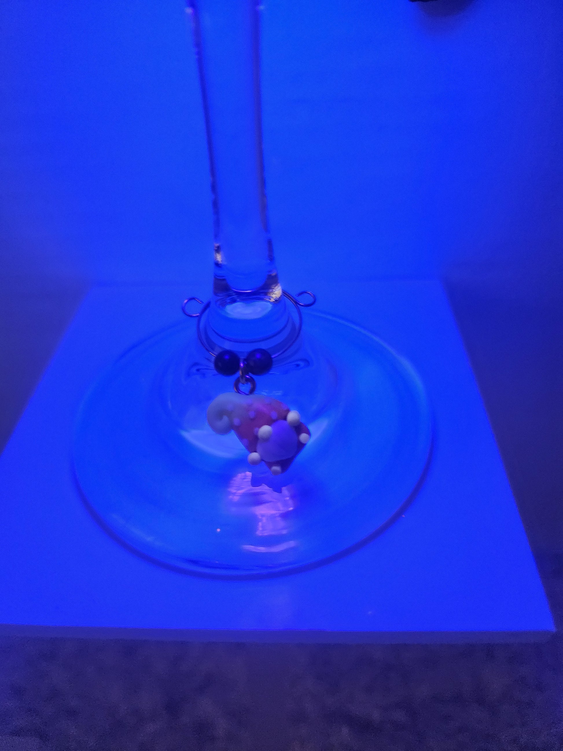 Gnome with Dragon Blood wine ring. Glows under black light. Dress up your wine glasses for any occasion or simply use the wine ring as a glass identifier for gatherings or special occasions. Easy to use. Simply spread apart and slip onto wine glass stem.